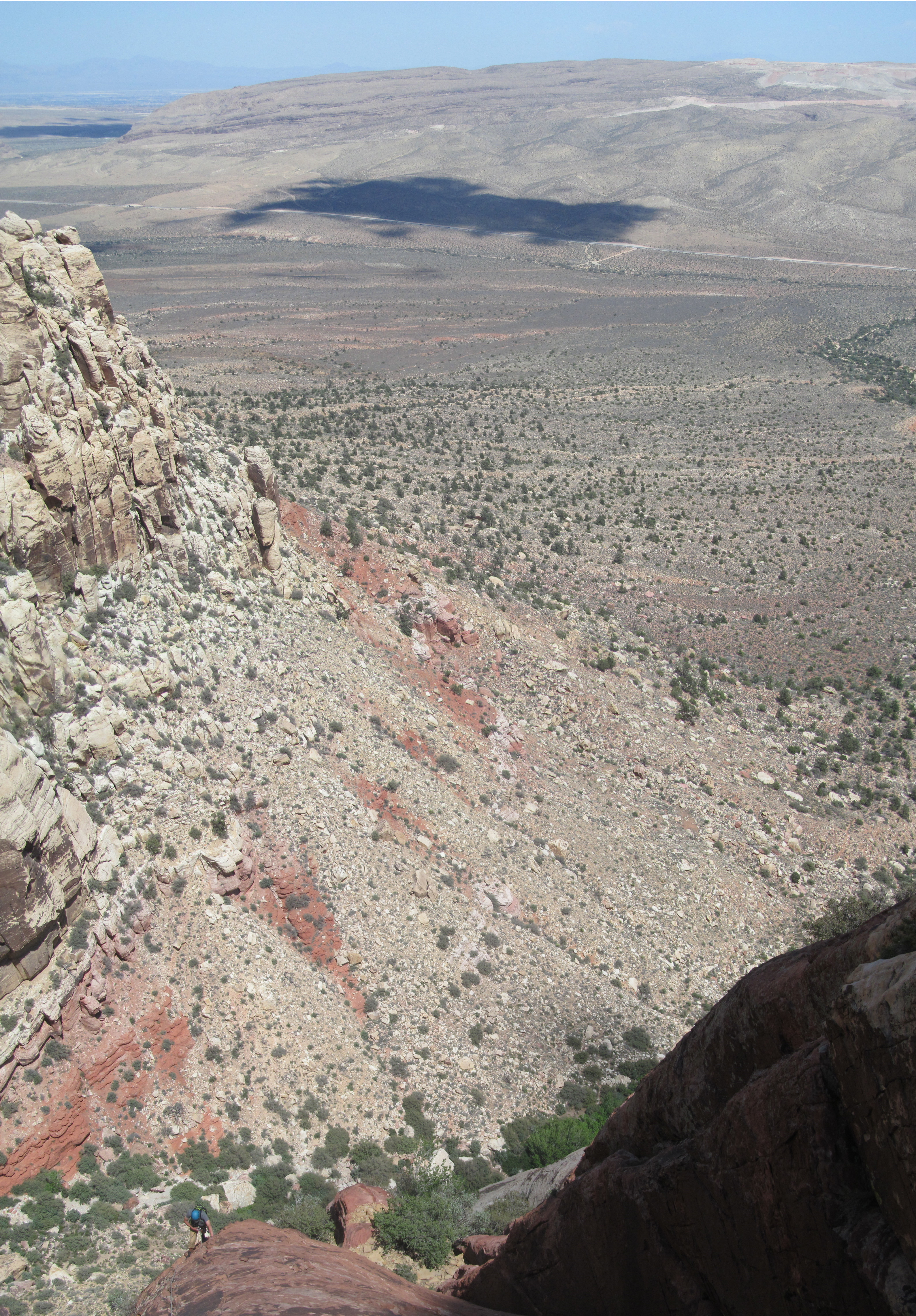 Tommy climbing the long slab of Hot Flash's (5.8) eighth pitch. Red Rock, NV