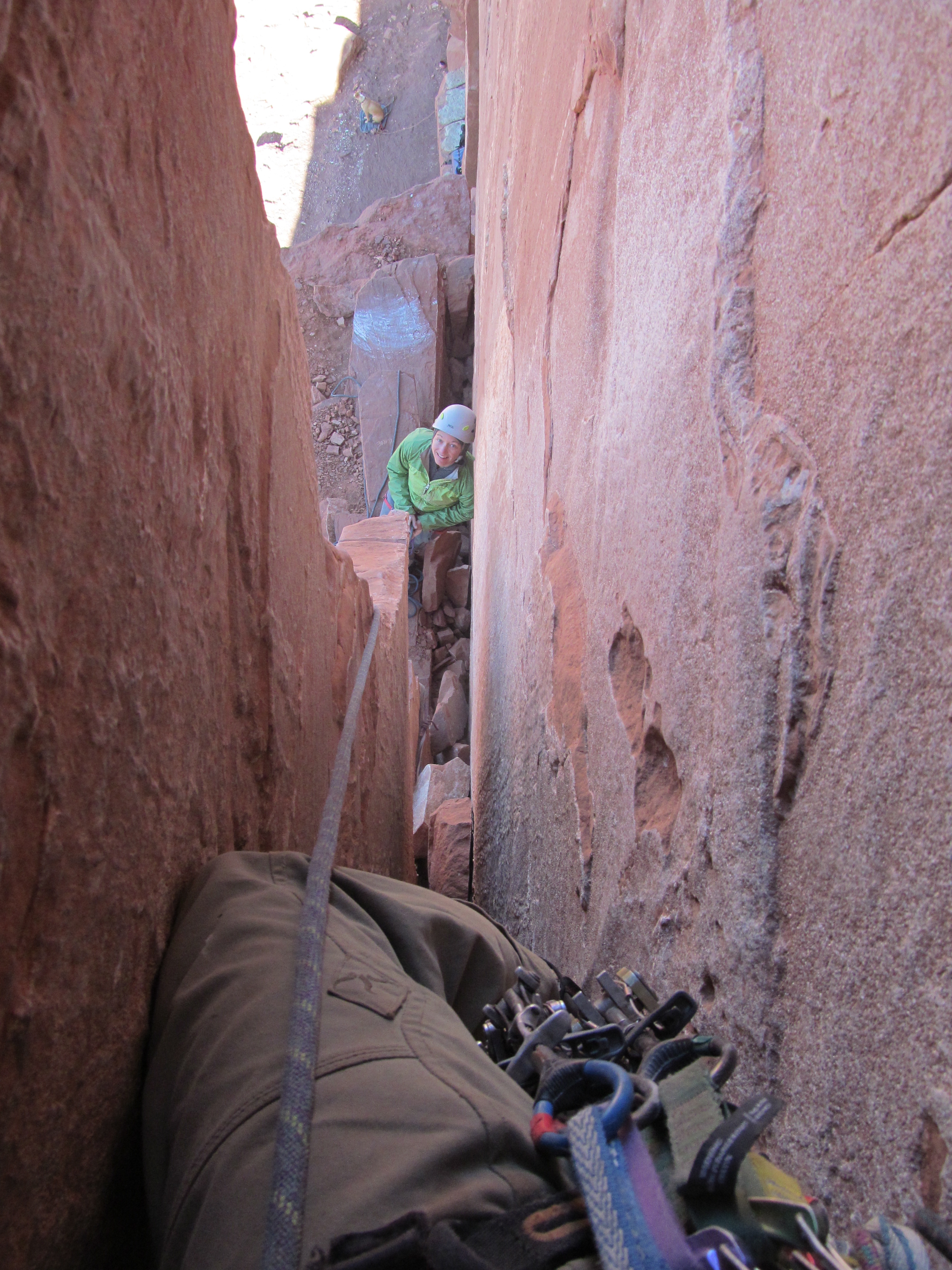 Looking down the chimney of the second pitch of Jah-Man (5.10-) on Sister Superior in Castle Valley, UT